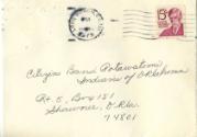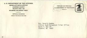 •Letter from Citizen Band Potawatomi Indians of Oklahoma, Ava Deleon, to Cynthia Agnew dated March 16, 1987, in regards to blood degree of Cynthia’s father and siblings, with mailing envelope. 1 pg.