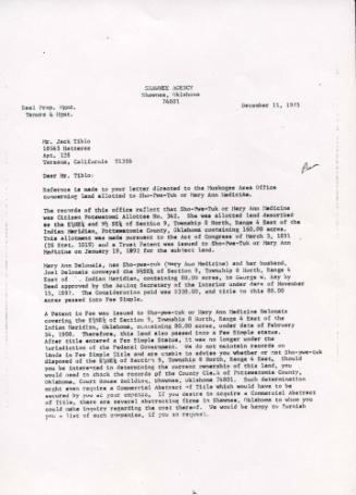 •Letter from Shawnee Agency December 11, 1975 to Jack Tiblo Re: Land allotted to Sho-Pwe-Tuk or Mary Ann Medicine allottee No. 342. Second page is deposition possibly related to letter (1st page). 2 pgs.