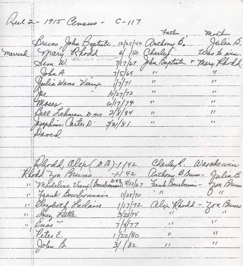 •Handwritten notes from the 1915 Census/John B. Bruno family and Rhodd, Vieux, Bourbonnais, LeClair; two copies of same page each have added notes.